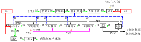 流程說明:食品生產(chǎn)污水經(jīng)收集管網(wǎng)匯集至調(diào)節(jié)池,調(diào)節(jié)水量均化水質(zhì)。之后經(jīng)提升泵提升至反應(yīng)池,加入混凝絮凝藥劑,調(diào)節(jié)pH后自流入初沉池。初沉池內(nèi)進行泥水分離,沉淀污泥經(jīng)排泥泵抽至污泥池,上清液自流入一段水解酸化池,在厭氧菌作用下將不溶性有機物分解成為可溶解性物質(zhì),將大分子難于生物降解的物質(zhì)轉(zhuǎn)變?yōu)橐子诮到獾男》肿游镔|(zhì),去除大部分有機污染物,為后續(xù)好氧生物處理創(chuàng)造有利條件。